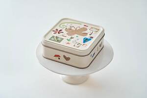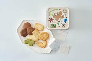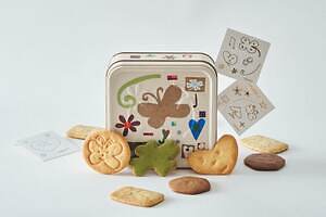 缶の中には、抹茶アイシングをかけたクローバー型のビスケットをはじめ、ハートとちょうちょの発酵バタービスケット、上品な紅茶の香りが広がるアールグレイビスケットなど全5種の味わいをセット。ちょうちょ・ハート・クローバーの3種は、オプナーのイラストや切り絵をもとに形にした、この缶だけの特別なビスケットだ。
