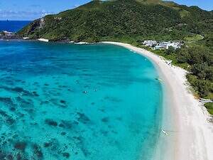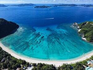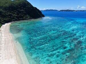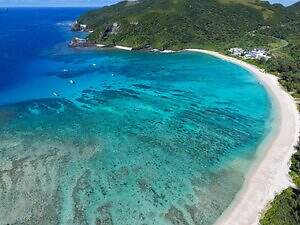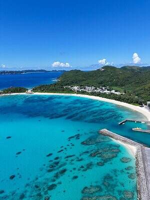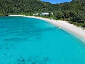 渡嘉敷島のメイン海水浴場。約800mの白砂と明るい砂地にエメラルドグリーンの海が広がり熱帯魚観察もしやすい。少し沖にでると透明度が上がる。シュノーケルをするなら、バナナボートで少し移動して、ハナリ島までいくのがおすすめ。