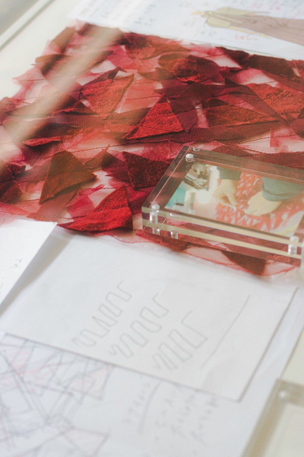 ミューラルがエンブクロスと出会ったとき、そのサンプルはシンプルな佇まいであり、幾重にも重なったものではなかった。しかし、「繕う」という今季のテーマを掘り下げるなか、そうして生まれるものは、整ったものであってはならない。自分たちが葛藤を抱えつつ歩んできた軌跡を、綺麗に整えたものにはできないという思いがあったのだ。心をレイヤーで覆うように、素材を重ねてゆくこと。けれども立体的に、表情豊かに「花の絨毯」を表現すること——そうした発想が、異なる形のベロアやチュール、オーガンジーを重ねる、ミューラルならではのエンブクロスへと結実したのである。