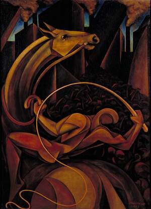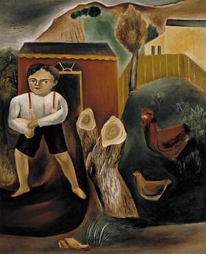 日系移民作家として取り上げるのは、アメリカに渡った国吉康雄(くによし やすお)や石垣栄太郎(いしがき えいたろう)、アメリカ生まれの野田英夫(のだ ひでお)の3人。荒木と3人の画家に重なる視点に目を向けつつ、荒木の《Stray Dogs》、国吉の《鶏に餌をやる少年》、石垣の《鞭うつ》、野田の《風景》といった作品を紹介する。