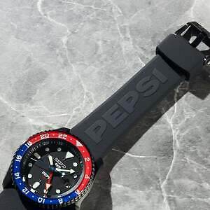 一方GMT機能付きのムーブメントを搭載したモデルは、ペプシの現在のロゴが着想源。ブラックをメインカラーに、青と赤をベゼルに配した。ケースサイズは42mmで、“PEPSI”のフォントとロゴを配したシリコンストラップを組み合わせている。