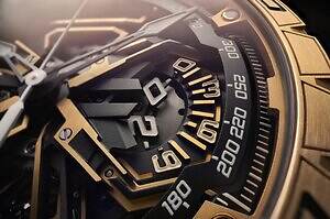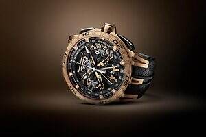 特徴的なのは、タイヤを思わせるノッチディテールを配したベゼルや、スーパーカーのホイールリムに着想した5本アームのローターなど、モータースポーツのスピード感を表現したデザイン。軋むタイヤ跡のようなパターンを施したブラックカラーのラバーストラップも目を引く。ケースには18Kピンクゴールドを採用し、存在感のある腕時計に仕上げた。