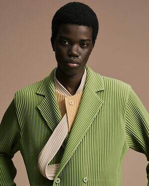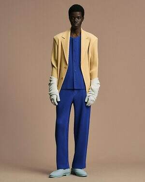 あわせてチェックしたいのは、オム プリッセ イッセイ ミヤケのテーラードシリーズから新たに登場するセンタータックパンツ。プリーツを施したパンツに、腰周りから裾に向かって大きくタックを施すことで、プレイフルなシルエットを楽しめるようになっている。身体の動きにタックの開きとプリーツの動きが連動し、波打つようなラインを描くのが魅力だ。