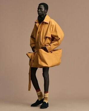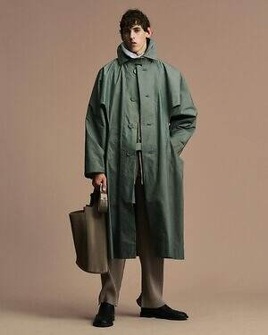 また、程よいハリがありつつも柔らかな素材の特性を生かし、立体的なフォルムに仕上げた。裾を大きく折り返し、ストラップで固定することができるため、大きなポケットが体の周りを囲うようなスタイルで着ることもできる。