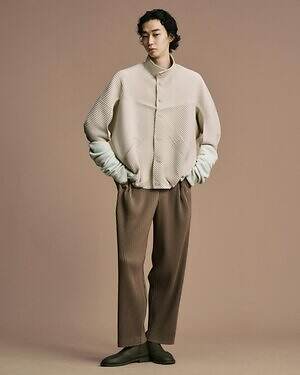 「石を観察して学んだこと」を基盤にアイディアを広げていった、オム プリッセ イッセイ ミヤケ 2025-26年秋冬コレクションから、秋冬のアウターやボトムス、ニットウェアなどが登場。石の形や模様、色彩から着想を得たデザインが、ウェアに反映されている。