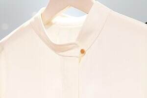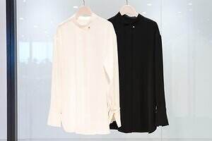 スタンドカラーシャツは、ハルノブムラタのウェアを彷彿とさせる、首元の小さなメタルボタンがポイント。袖口にもメタルボタンを配し、上品さをプラスした。また、生地には、とろみのある柔らかなバックサテンを使用し、美しいドレープを生み出している。