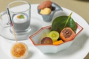 締めくくりには、季節の果物と和の甘味を盛り合わせたデザートプレートが登場。みずみずしいぶどうや柿など秋ならではのフルーツに、和菓子や月見杏仁豆腐を添えて彩り豊かに仕立てている。