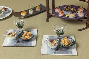 お月見をテーマにした和のアフタヌーンティー「ジャパニーズ アフタヌーンティー~華凛~」は、寿司職人の技で仕立てた華やかな手毬寿司やアレンジ寿司が主役。季節の前菜や蒸し物、和の甘味も揃え、寿司スタイルで楽しむ特別なアフタヌーンティーとなっている。35階からの景色を眺めながら、秋ならではの豊かな味覚とともに優雅なひとときを満喫できる。