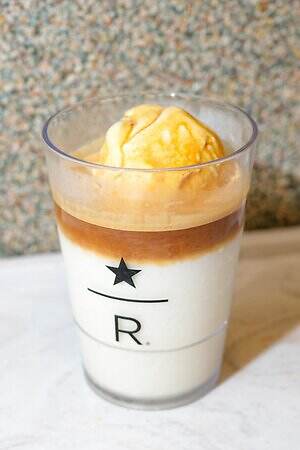 アフォガート風のフラペチーノ「スターバックス リザーブ エスプレッソ アフォガート フラペチーノ」も要注目のメニューのひとつ。バニラアイスクリームをトッピングしたミルクベースのフラペチーノに、スターバックス リザーブのエスプレッソを注いだ、とろける甘さと深いコクのコントラストが楽しめる一杯となっている。