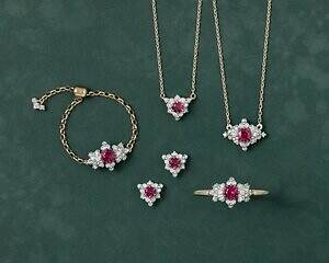 一方、“輝きの花々”を意味する「フルール・デクラ」は、発色にこだわって厳選したカラーストーンとダイヤモンドをあしらい、トライアングルを重ねたような洗練されたフォルムが特徴。可憐な小花がセンターストーンに寄り添い、晴れやかな印象を演出する。シンプルでありながら、熟練の職人による丁寧な細工が光るネックレスとピアスが揃う。