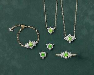 コレクションを彩るセンターストーンは、ダイヤモンド、ルビー、アクアマリン、そして鮮やかなグリーンが印象的なデマントイドガーネットの4種類。