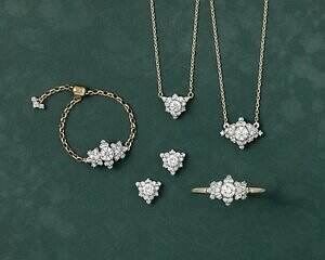 “花々の歌”を意味する「シャン・デ・フルール」は、センターストーンをダイヤモンドの小花が囲む華やかなデザイン。形の異なる石を立体的に組み合わせ、花弁が重なり合うような姿を繊細に表現している。コンパクトなサイズながらも、凛と咲く花の存在感が際立つ。アイテムはチェーンリング、ネックレス、リングの3種類で展開される。