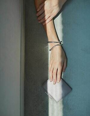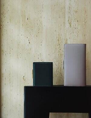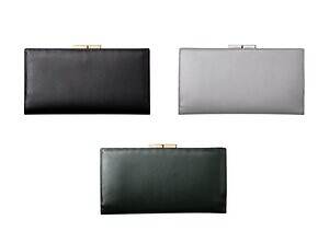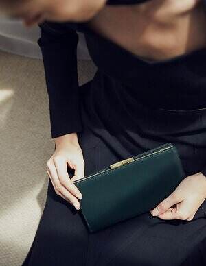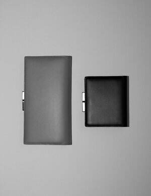 ウォレットは、長財布と二つ折り財布の2型をラインナップ。ミニマルな表情に仕上げることで、イタリアンボックスカーフの柔らかな光沢感を引きたてた。控えめに輝く口金が、全体の印象を引き締めている。カラーは、ブラック、グレー、ダークグリーンの3色を展開する。