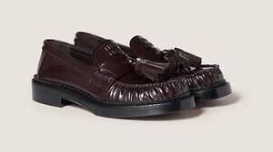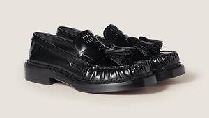 クラシックなメンズシューズが由来のタッセルシューズを、ミュウミュウの視点で再解釈した「タッセルローファー」。光沢のあるレザーを用い、クラシックとモダンを融合させた、エレガントな佇まいに仕上げている。