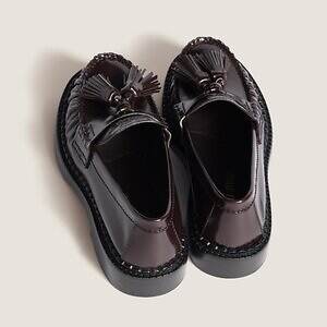 全体は、ブラック、またはダークブラウンのワントーンでシンプルな見た目に。つま先のギャザー仕上げ、甲部分のブランドロゴ、歩くごとに揺れるタッセルといったディテールで遊び心を加えている。