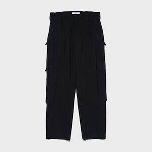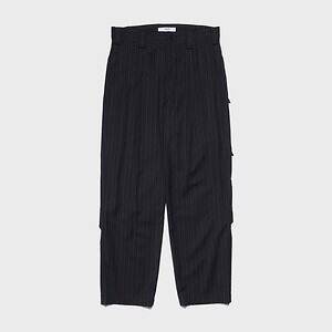 パンツは、ウジョーの1タックワイドパンツをベースに、大胆なカッティングで仕上げたポケットを配置。ワークパンツを基調としつつ、ウール素材を用いることで、上品な佇まいにまとめている。カラーは、ブラックに加えて、ストライプ柄を用意する。