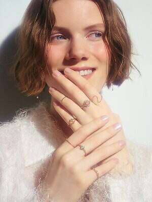 また、2本で3本重ねているかのように見える「トリックリング(Trick Ring)」も要チェック。”永遠の幸せを運ぶ”という思いを込めたリースモチーフのリングでは、グリーンやブルーからクリアに連なる天然石を楽しめる。