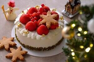 フランス伝統菓子・シャルロットをアレンジしたクリスマスケーキは、レガレヴによるもの。沖縄県産バニラを使ったブリュレを中心に、瀬戸内レモンが香るジェノワーズとムースを合わせて、たっぷりのベリーでデコレーションした。