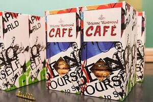 店頭では、「ヴィヴィアン・ウエストウッド カフェ」限定グッズも販売。マグカップやタンブラー、エプロンなど、カフェならではの商品が展開される。
