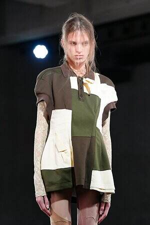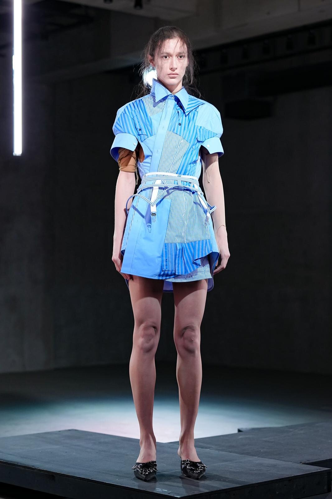 エッセンシャルなアイテムを再構築したルックは、複雑なパッチワークをいかして肌との空間、あるいは密着を楽しんでいる。マニッシュなシャツ生地の組み合わせから生まれるミニワンピースは、身体のラインに沿う一方、共布で施したパニエの骨組みによって、新たな服の輪郭を生み出している。