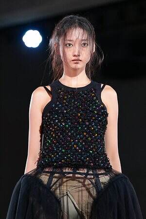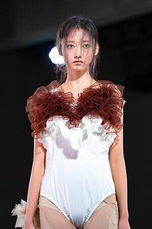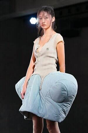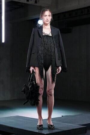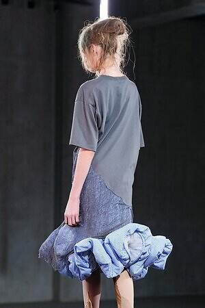 クラシックなバレエコアのムードは、先に述べたシャツスカートのパニエ以外にもある。例えば、胸元に大胆なフリルや毛足の長いフリンジをあしらってみせたレオタードのようなピースだ。また、毎シーズン披露されるクリノリンのスタイルは、あえて相反するマニッシュかつ日常着であるシャツ地を用い、コブのような歪な形で表現した。