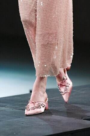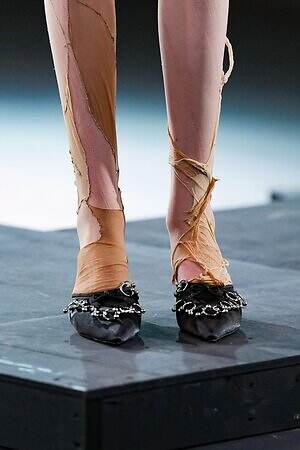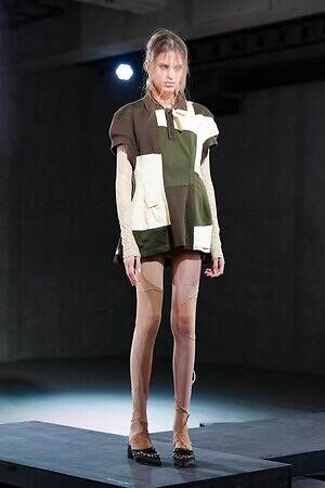 最初に、繋ぎ合わせのデザインについて言及すべきだろう。第二の肌として纏うはずのヌーディーなタイツは、あえて不規則な接合を繰り替えすことで本来の役割を曖昧にしている。これは足元に登場するだけでなく、レイヤリングによってさまざまなところで登場し、着る人の本来の肌をぼかす。