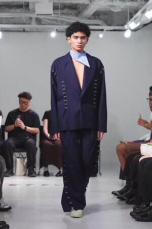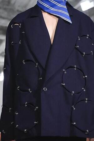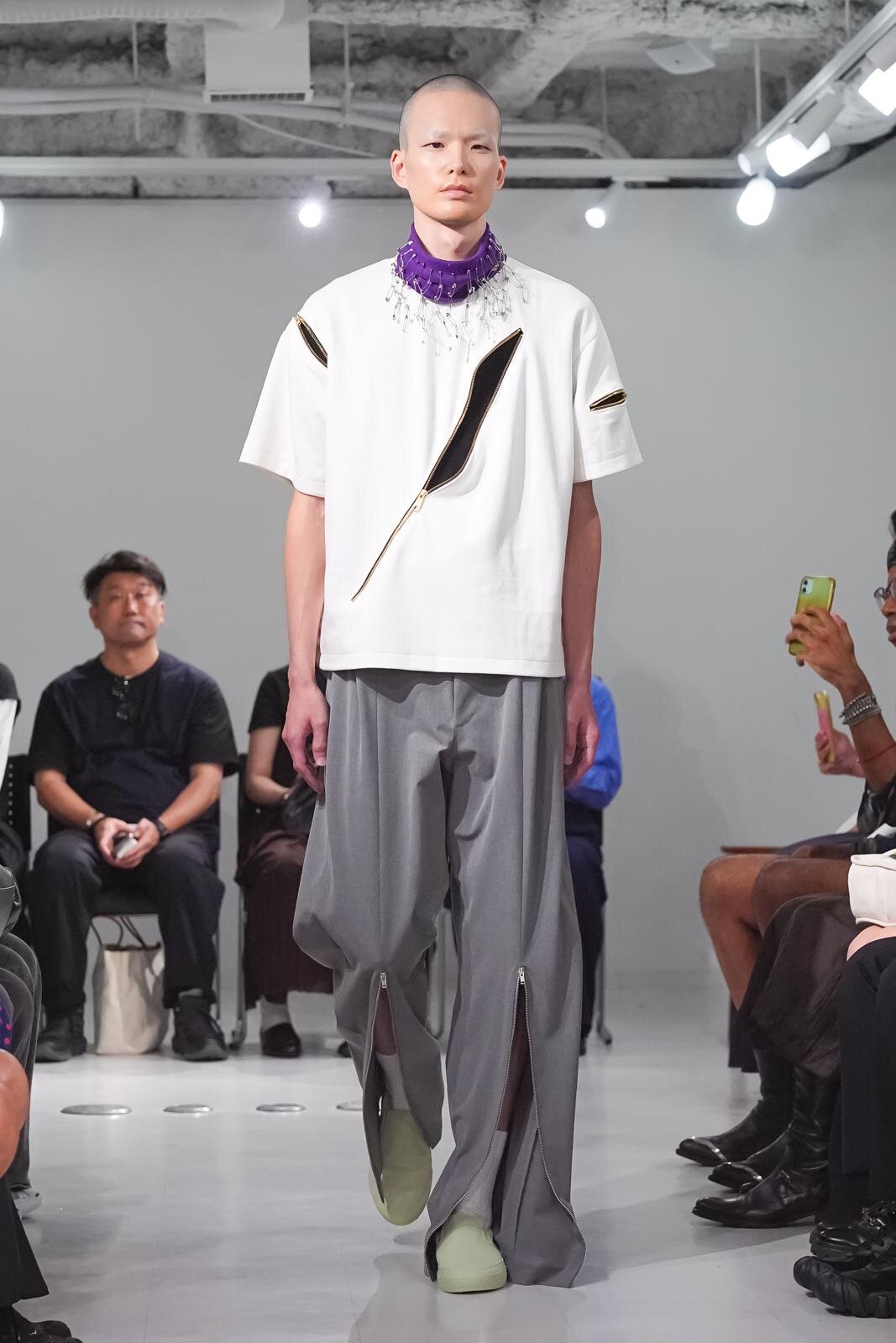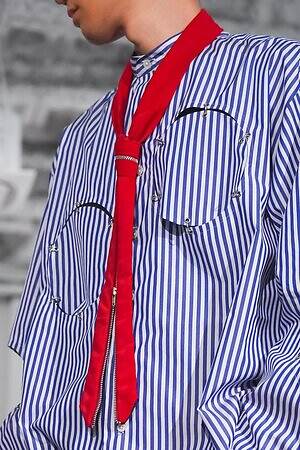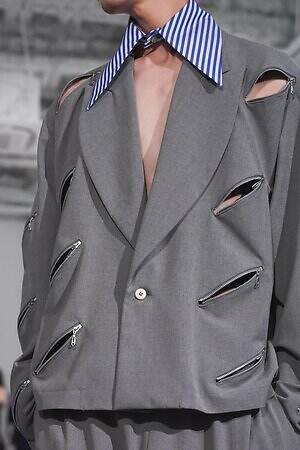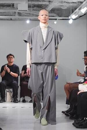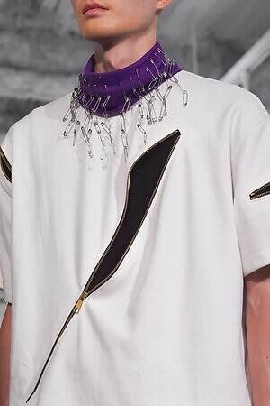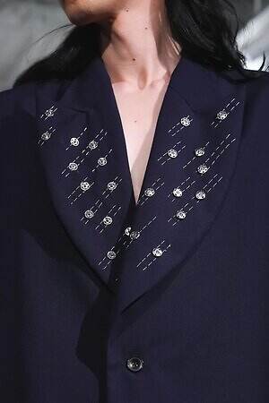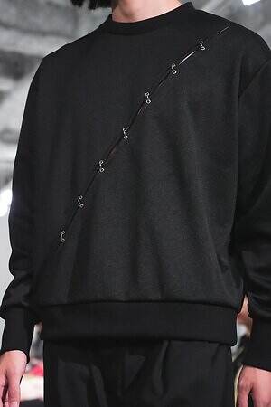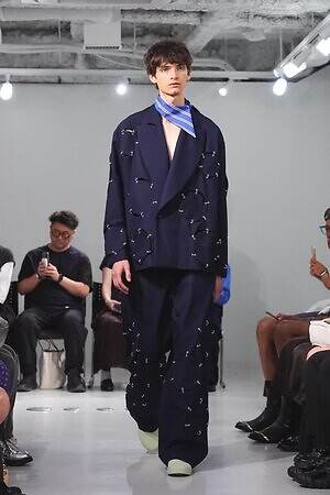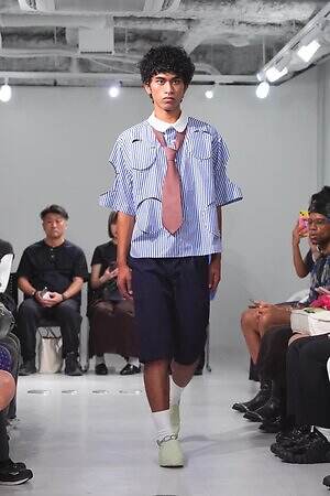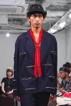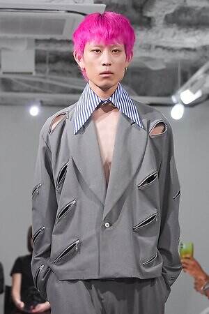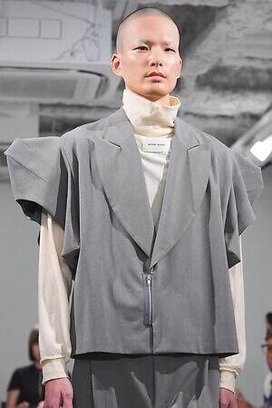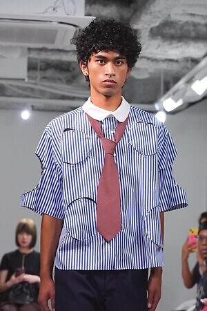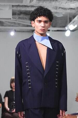 また、少年のイメージを重ねたという安全ピンは、シャツのボタンやネックカバーに大胆に配した。全面に短いジッパーをあしらったテーラードジャケットやパンツ、スナップボタンの凹凸をランダムに襟に縫い付けたベストも印象的。パンクテイストを思わせる金具使いは、無垢さの奥に潜む強さを際立たせているかのようだ。