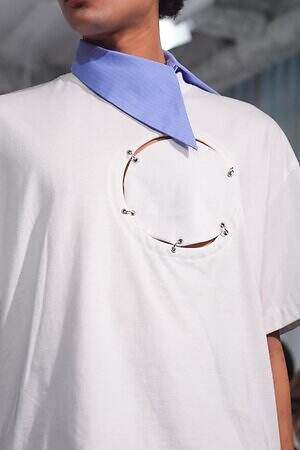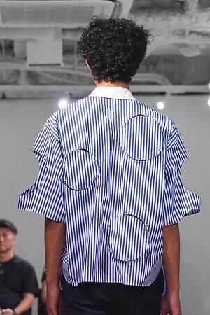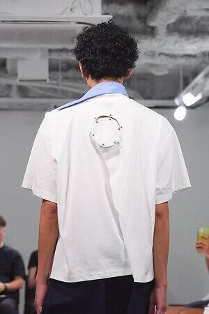 風が吹き荒れるような音の中登場したファーストルックは、丸くくり抜いた穴を金具と布で塞いだようなディテールで埋め尽くされたセットアップ。Tシャツやストライプシャツなど、コレクションの随所に見られるこのデザインは、大きな困難に直面して夢を諦めかけた少年の心の穴が塞がり、再び旅へ踏み出す場面をイメージしている。