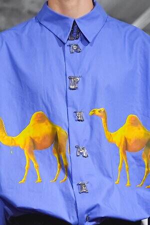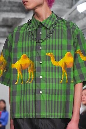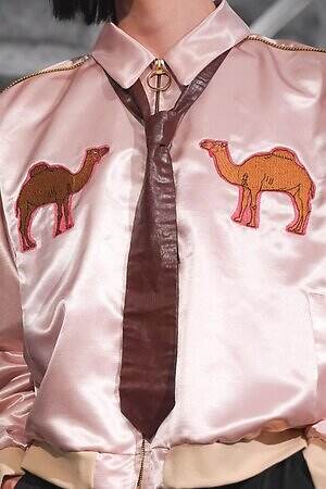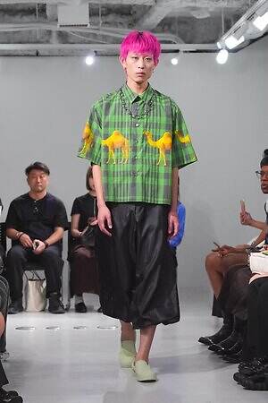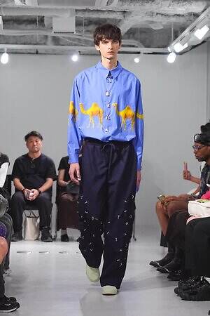 アイキャッチなのは、ラクダの写真をコラージュしたようなチェックシャツや、ラクダモチーフの刺繍を施したスカジャン。旅の道中で少年が出会うラクダをイメージしたという。浮かび上がるようにラクダが並ぶ非現実的な姿は、眠っているときや空想としての“夢”の光景にも見える。
