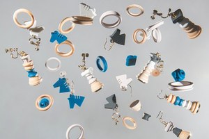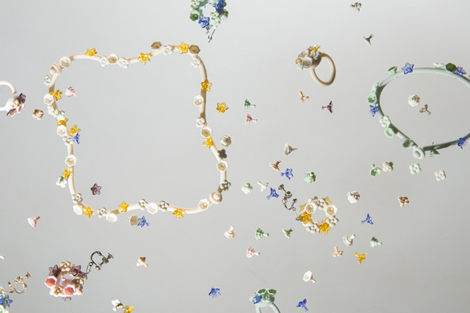 1コマごとに形成されたチェーンをつなげることで、長さや色の組み合わせを楽しめる「CHAIN-CHAIN」からは、ネックレスやブレスレット、イヤリングを展開。3種類の小花が愛らしい「FLORIST」は、別売りの小花パーツを付け替えることで、自分好みにカスタマイズできる。シリコンゴムと木を積み重ねた「CHECKMATE」のイヤリングやピアスは、チェスの駒がモチーフ。