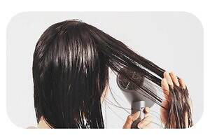 まずは前髪から。その後、髪の根元、中間、毛先の順番でしっかりと乾かす。髪の内側からドライヤーの風を当てるのがポイントだ。