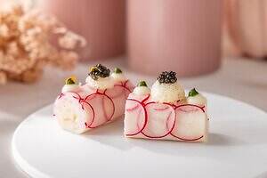 リスピークロックムッシュ タスマニアマスタード添え、ベジタブルバーガー かぼちゃ仕立て※スタンダードアフタヌーンティーにて提供、蟹のタルタルとカリフラワーヴルーテ、北海道産帆立とセロリラブのムース 春菊ピューレとキャビアを添えて※デラックスアフタヌーンティーにて提供