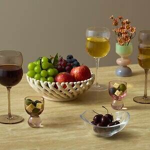 旬のワインやシャンパンを楽しむグラスも、愛らしい”もこもこ”シェイプに。ブラウンとクリアの落ち着いたカラー展開で、キャッチーなフォルムながら自然と食卓に溶け込んでくれる。