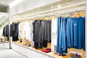 たとえば、MLBロサンゼルス・ロジャース所属の野球選手、大谷翔平シグネチャーコレクション「The Ohtani Signature Collection」が充実のラインナップで店頭に並ぶ。特別なロゴを配したスウェットやTシャツのネイビー、ホワイト、ブラックといったカラーが、壁一面にずらりと並んでいる。
