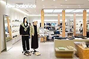 「ニューバランスニュウマン高輪店」は、ブランドを象徴する"グレー"をコンセプトに、コンクリートとウッドを組み合わせた洗練された空間を演出。米国製・英国製のプレミアムモデルをはじめ、スニーカーやアパレル、アクセサリーまで幅広く揃え、上質なライフスタイルを提案する。