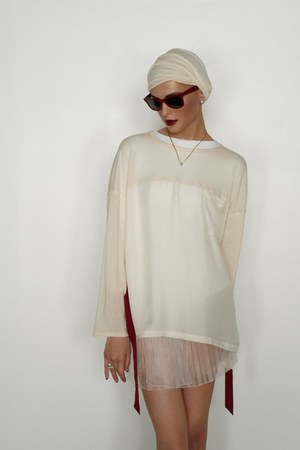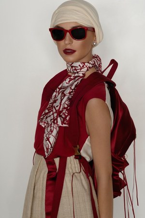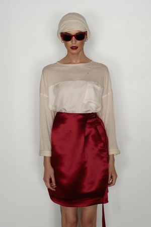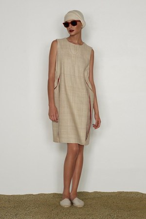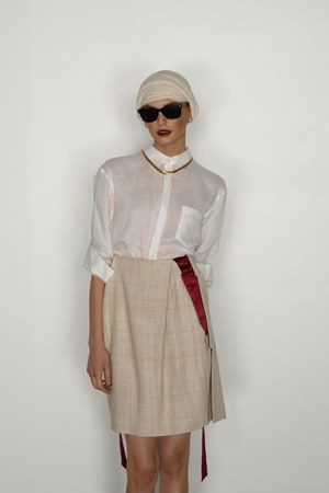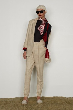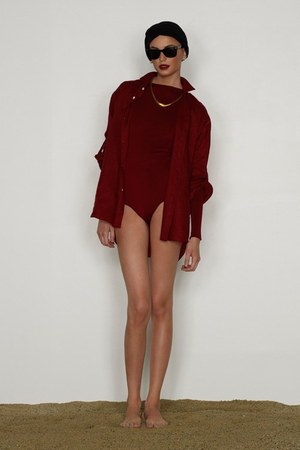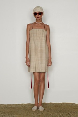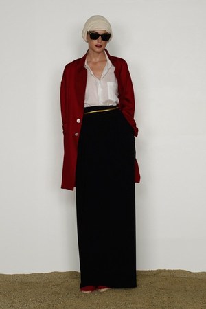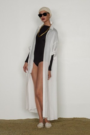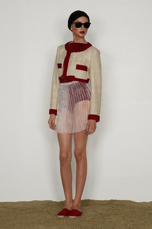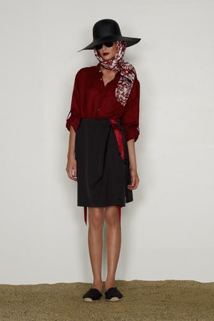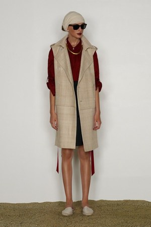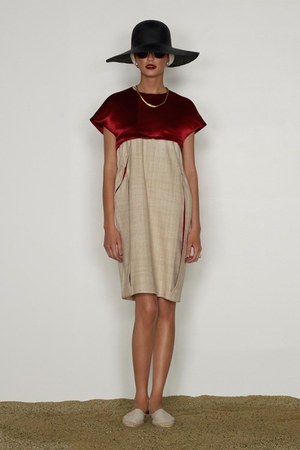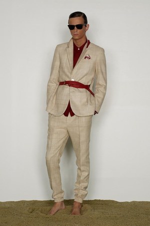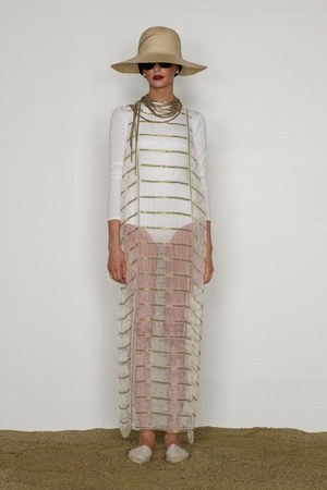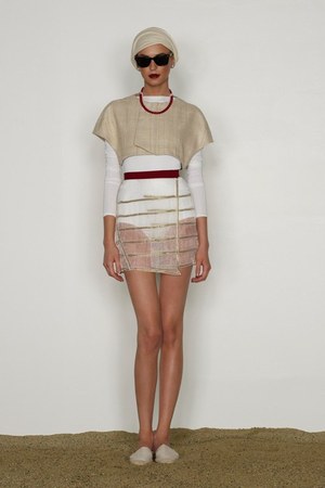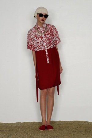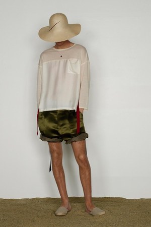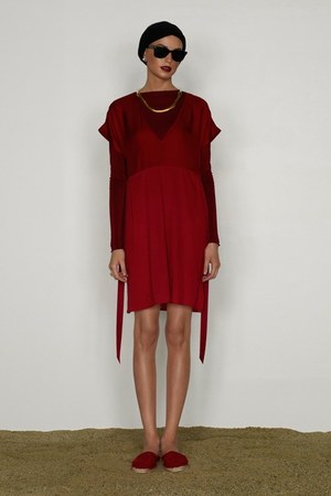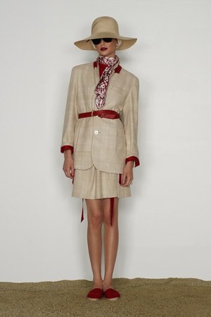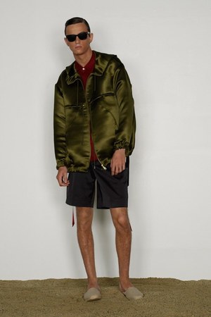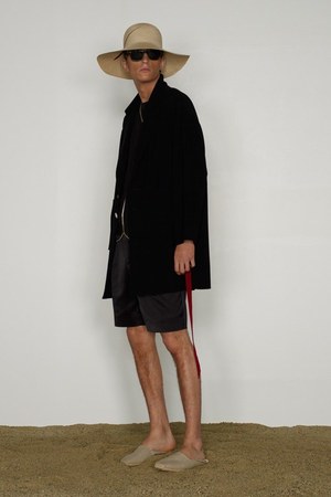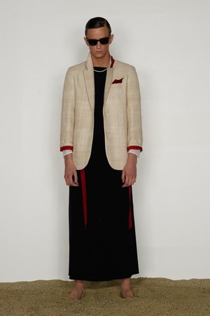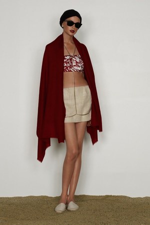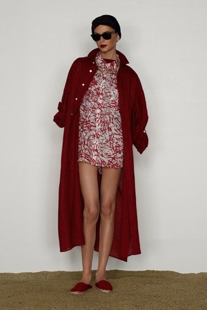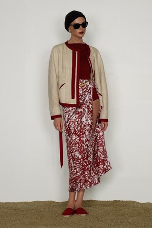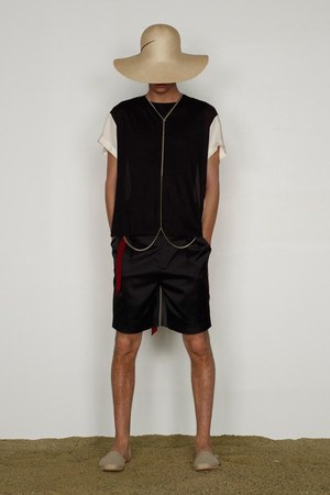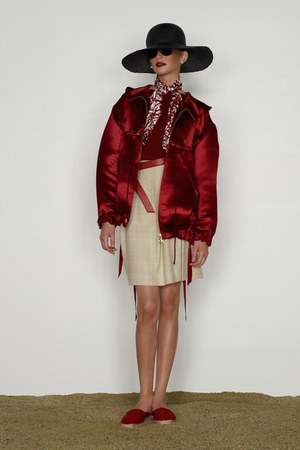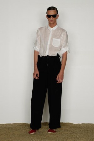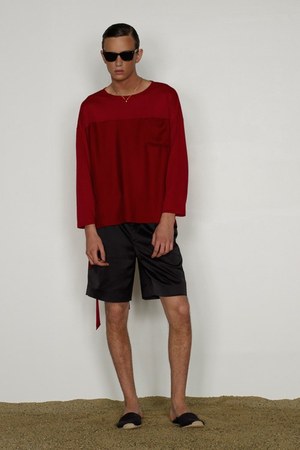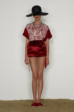 カミュの「異邦人」に出てくる“太陽”を表現した深紅を、ゆったりとしたリゾートウェアに合わせているのが印象的。これまでのモノトーンのコレクションとは対照的に、深紅以外にもベージュやカーキといった色も使われている。白地にプリントされた深紅のグラフィックは、クリエイティブ集団tomatoの創立メンバーであるジョン・ワーウィッカーとのコラボレーションによるもの。