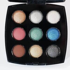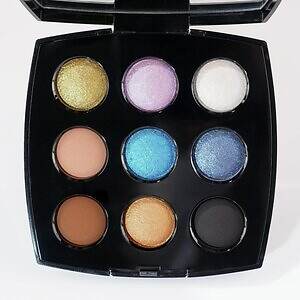 ピンクの輝きを持つアンバー ゴールド、メタリック シルバー、透明感のあるブルーのハイライター、マット レッド、ターコイズの輝きを持つグリーン、シマーなディープ ブルー、マットなダーク シエンナ ブラウン、サテンのようになめらかなアイヴォリー ゴールド、シルバーのきらめきが入ったブラック