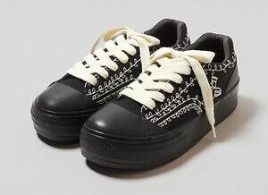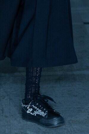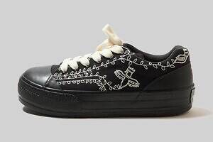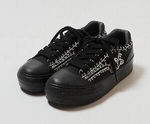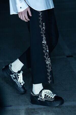 シンヤコヅカとコンバースのコラボレーションでは、「絵に描いたような情景」に着想した厚底スニーカーを用意。コンバースの「オールスター ボーダースター OX(ALL STAR BOARDERSTAR OX)」をベースに、手描きの⿃・額縁・⽉のモチーフを刺繍で施した。