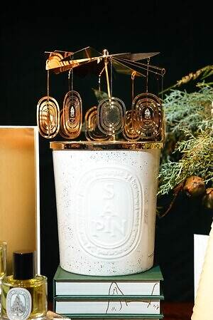 ディプティックのクリスマスの代名詞ともいえるカルーセル。クリスマスコフレ第4弾では、エクストララージ キャンドルに対応できる大きなサイズが登場する。キャンドルと一緒に使う香りのアクセサリーで、明かりを灯すとくるくる回り、キャンドルの明かりをより幻想的にみせてくれる。2025年はディプティックのアイコン“オーバル”を並べたデザイン。