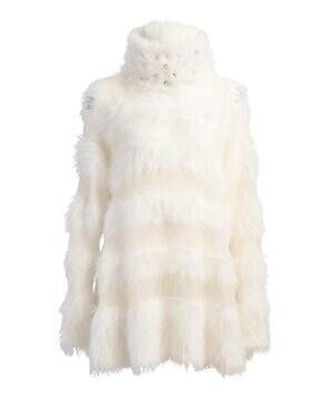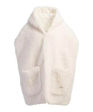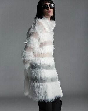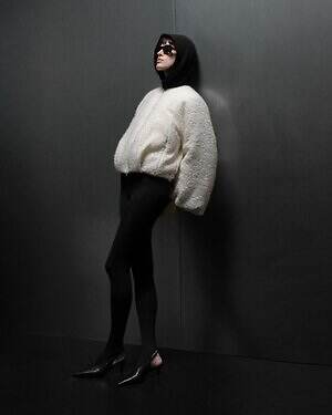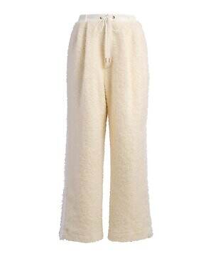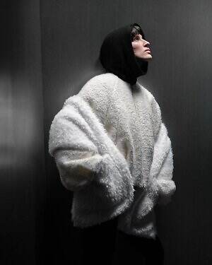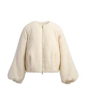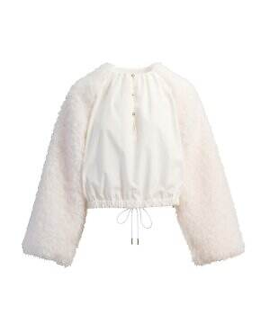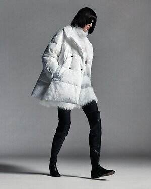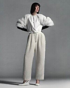 温かみのあるウール糸を用いたダウンブルゾン「アマビレ」も要チェック。数種類のウール糸の中に、繊細にきらめくスパンコール糸を入れて織り上げることで、光を秘めたウールツイード生地に仕上げた。同素材のパンツと合わせれば、真冬にぴったりなオールホワイトコーデを楽しめる。