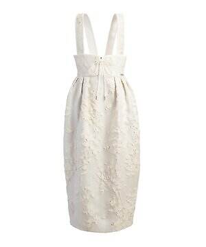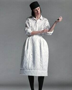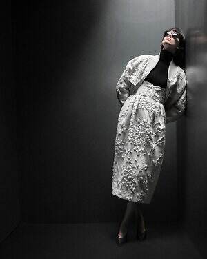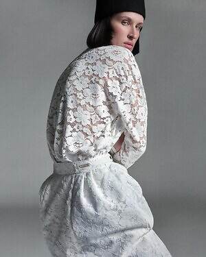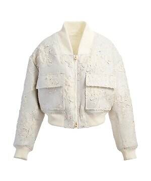 まず、‟冬コーデの主役”となるダウンジャケットの中でも、ショート丈の「ビブランツァ」に注目したい。清廉なホワイトカラーに、輝くシルバーとオフホワイトで花柄をあしらったジャカード生地が特徴だ。カジュアルからセミフォーマルまで、幅広いシーンで活躍してくれそう。