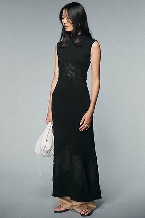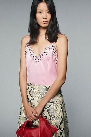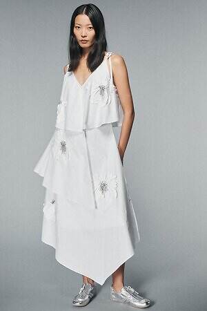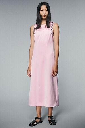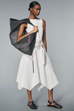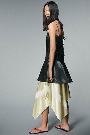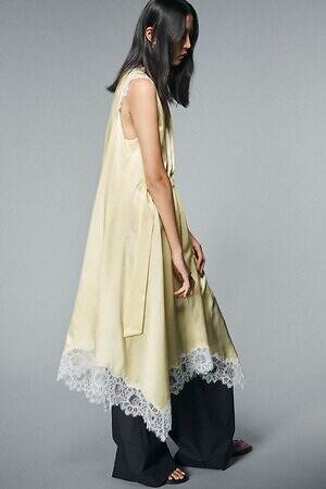 ユニークな素材使いが光る、‟ディ トゥ イブニングウェア”にも言及したい。サテン地のキャミソールドレスは、深くカットされた胸元にスタッズやビジューを配し、センシュアルなムードに武骨なディテールをプラス。程よく分厚いハリ感のあるサテンを用いているため、大胆かつセンシュアルな構造ながらも、ボディラインを拾いすぎず、絶妙なバランスを保っている。