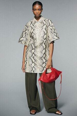 また、しなやかなレザーにバターイエローのパイソンプリントを施しているのも斬新で面白い。クラシカルなストレートスカートや襟付きドレスにジップラインを組み合わせ、ディテールにギミックを効かせていた。