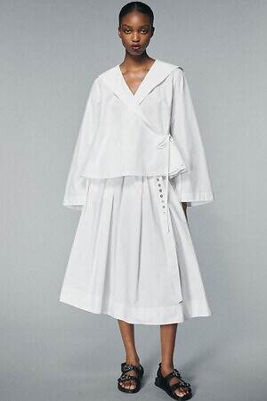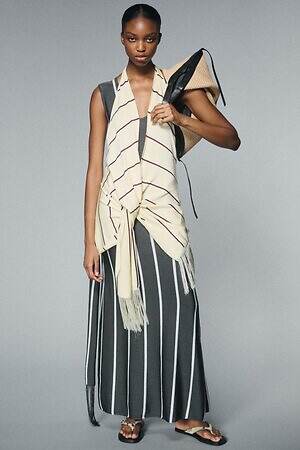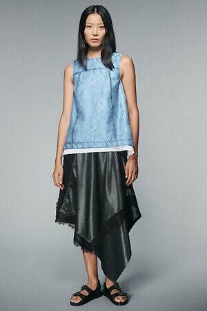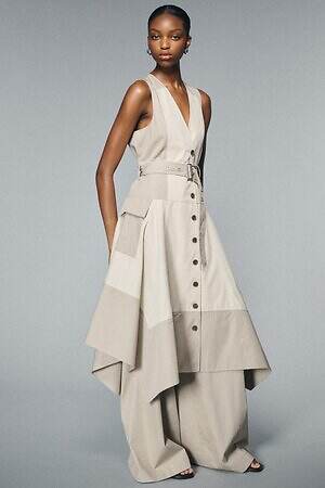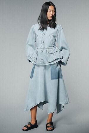 たとえば「デニム・アンドーン(denim undone)」として再解釈されたデニムは、ウエストバンドを取り除き、抜け感あるシルエットに。テーラードジャケットは、あえてギャザーやカットアウトを施すことで、“未完成のエレガンス”を表現している。