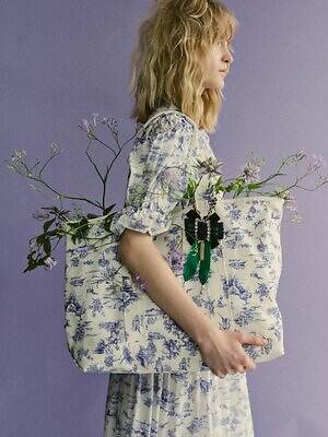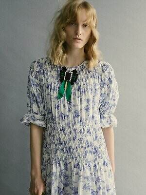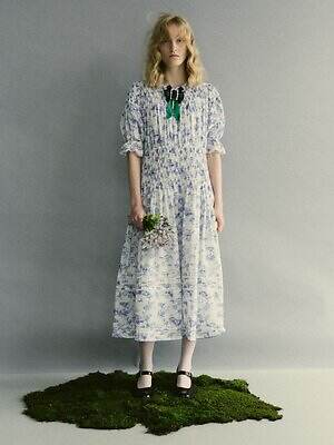 スモッキングによるこまかなひだがポイントのワンピースを彩るのは、色鮮やかなトワル ド ジュイプリント。乗馬が趣味のエリザベートが様々な地へ旅し、そこで見たであろう風景を描き出している。蛍光カラーのピンクやグリーン、ブルーを採用し、ネオクラシックな雰囲気に。