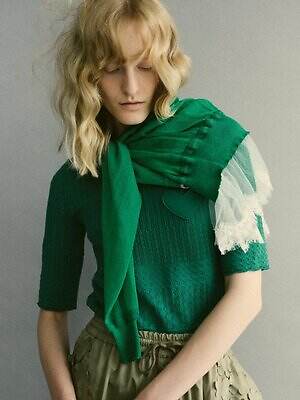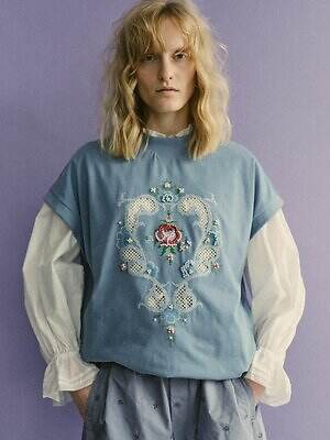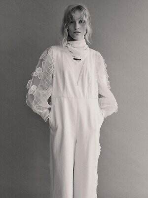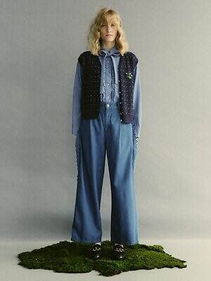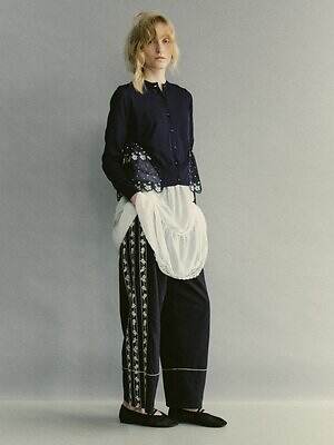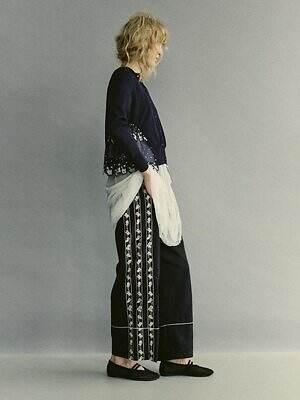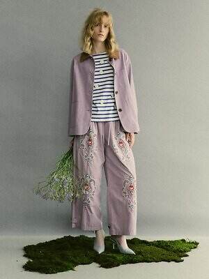 今季のボトムスは、大人の女性の抜け感を演出するややワイドなシルエットに。当時の宮廷で流行したプチポワン刺繍とネオンカラーのビーズを組み合わせたバーンジャケットとボトムスのセットアップは、特にカジュアルでリラクシングなムードが漂う。