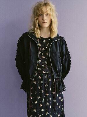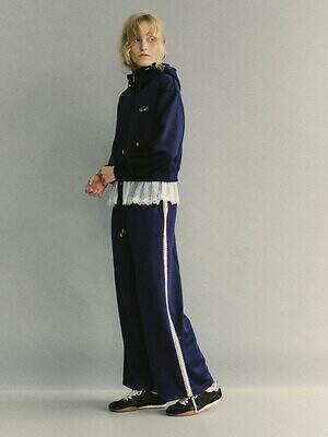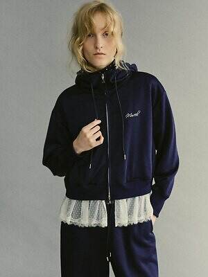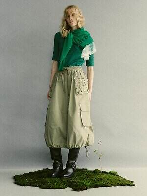 スポーティなルックを差し込むことで、ビターなテイストもプラス。それを象徴するのが、スポーツライクな生地にロマンティックなカットワークレースを施したスカートなど。シャカシャカと音がたちすぎないよう、ハリ感のある素材をあえてチョイスしている。