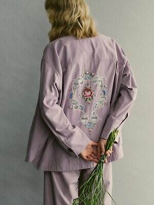 目を惹くのは、エリザベートが愛したスミレの花モチーフ。1輪ずつ丁寧に刺繍し、ストライプ柄を完成させたオリジナルファブリックのジャケットとパンツ、ロングスカートが揃う。スミレ刺繍は、白い糸で刺繍した後、マッピングで刺繍糸のみに色をプリントすることで、水彩画のような表情を生み出した。