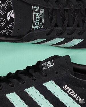 限定で展開される「ハンドボール スペツィアル」は、ブラックのアッパーに、爽やかなクリアミントのスリーストライプスを走らせたモデル。アクセントとしてメタリックシルバーの“SPEZIAL”ロゴを配した。レトロなフォルムながら、洗練された色合いでどこかモダンなムードを醸し出す。
