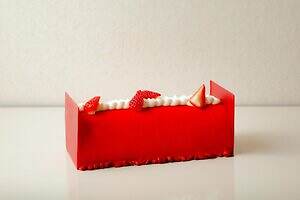 まずは、クリスマスらしい鮮やかなレッドカラーで彩った「あざといちごのブッシュ」に注目。京都産の“あざといちご”をふんだんに使った、甘酸っぱさと華やかな見た目を兼ね備えた一品だ。トップのデコレーションに加え、ふっくらと焼き上げたスポンジにもいちごをサンド。濃厚な北海道産生クリームのシャンティで包み込んでいる。